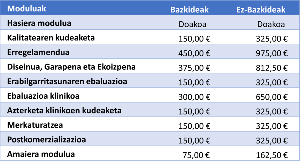 Tarifak moduluka Bazkideentzat eta Ez-Bazkideentzat (BEZ-a kanpo):